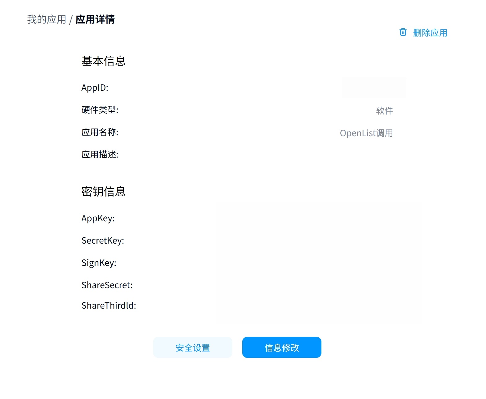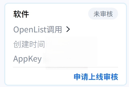 9. 回到应用详情页,复制必要的Appkey与Secretkey 10. 使用OpenList Token 获取工具通过百度网盘验证登录填写对应的Key,获取令牌。 11. 按照本方法开始处的图片填写对应的参数和设置即可使用。内置API调用的实现方式,利用我们建立的服务器中转刷新access_token,目前已经上线,勾选使用OpenList提供的参数,点击获取token即可获得刷新令牌。在OpenList的存储配置界面,打开使用online api选项,经刷新令牌填入即可使用。