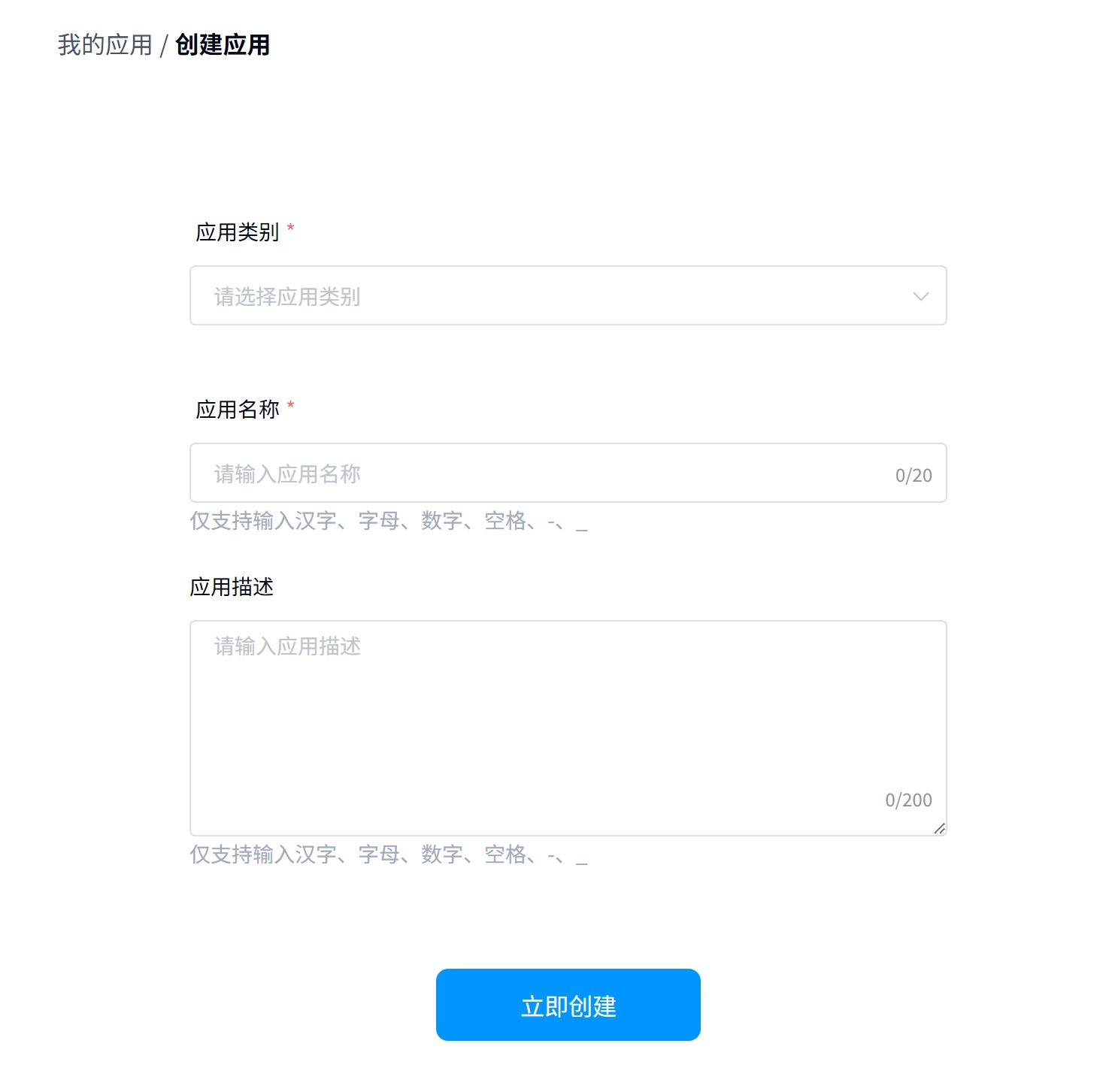 6. 选择应用类别为”软件“,并按自己的想法填写应用名称和描述,请注意这三个内容一旦设定完成无法更改,请深思熟虑后填写。
